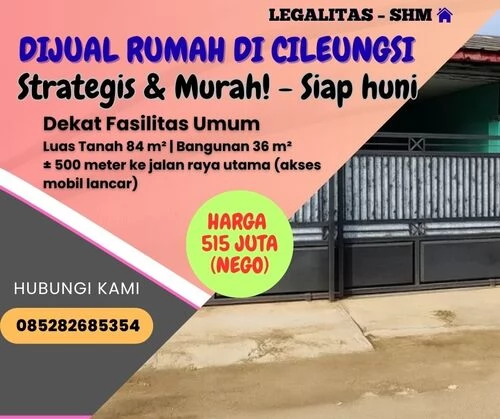 💥 Promo Spesial! Jual cepat rumah SHM di Cileungsi hanya Rp 515 juta (nego) – siap huni, strategis, nyaman, dan cocok untuk keluarga maupun investasi. Jangan lewatkan kesempatan langka memiliki rumah dengan Sertifikat Hak Milik (SHM) di lokasi premium Cileungsi, Bogor. Hubungi WhatsApp 📲 6285282685354 sekarang sebelum kehabisan!